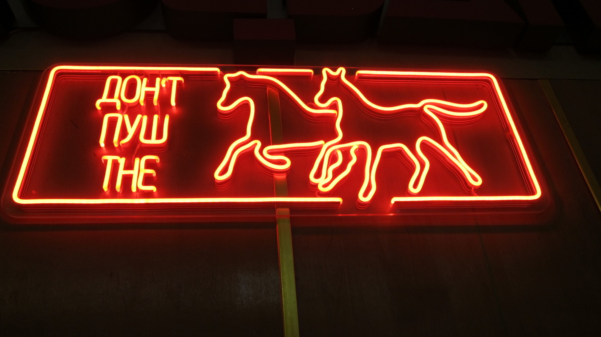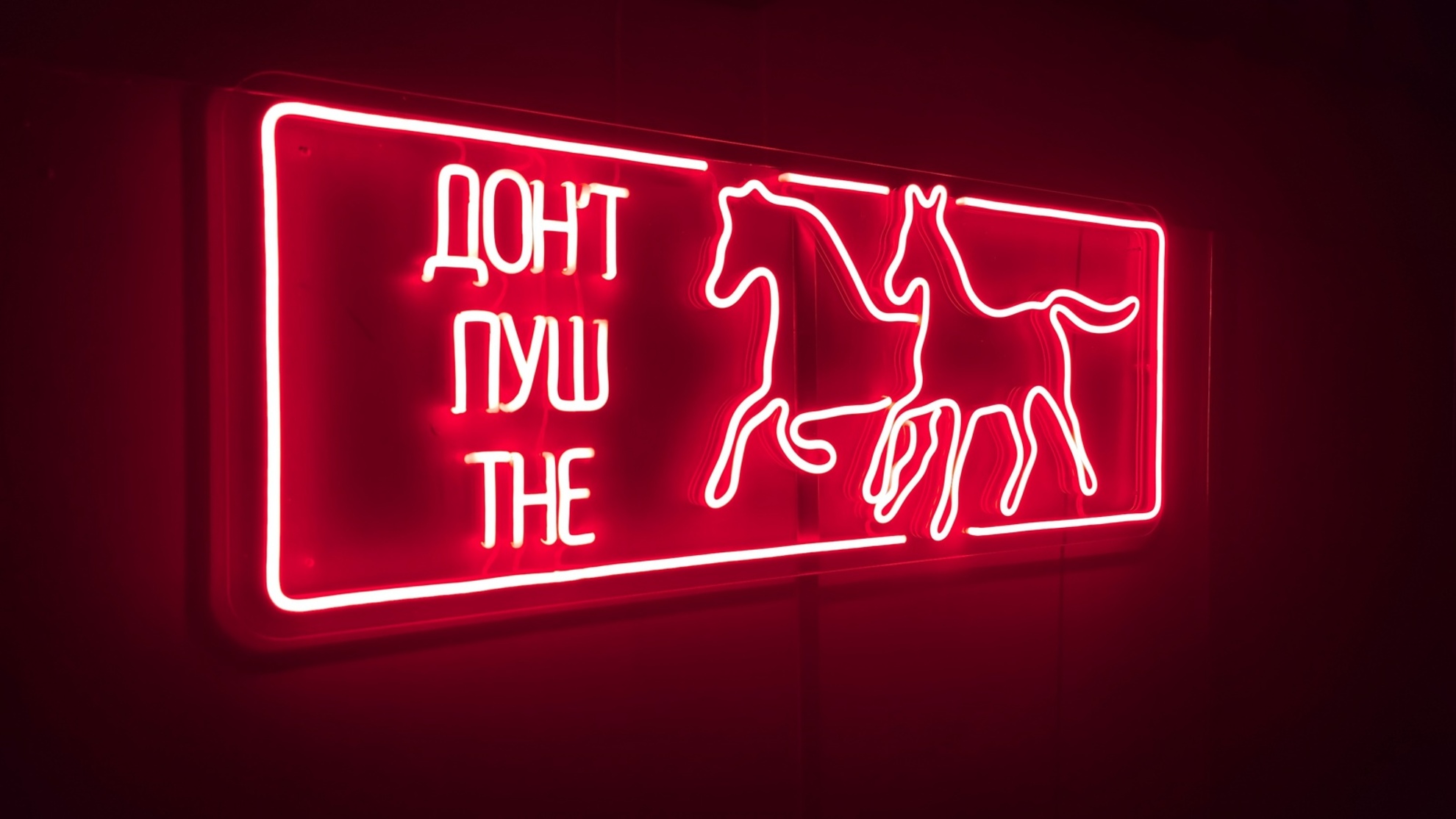 На вывеске изображены две бегущие лошади, символизирующие движение, силу и свободу, а рядом - необычная надпись «ДОН'Т ПУШ THE», выполненная в ярком красном неоне. Такое решение сочетает юмор, харизму и философский посыл: не стоит спешить, всему своё время. Технические характеристики: