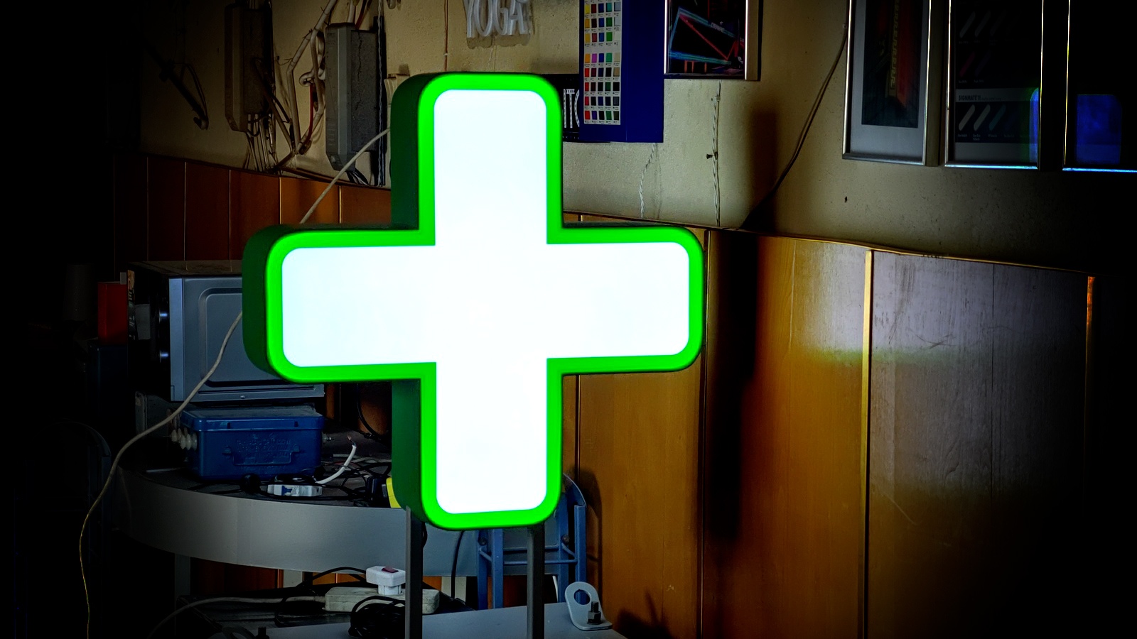 Готовый аптечный крест имеет белый фон, зелёный световой кант и зелёную боковину, благодаря чему отлично заметен днём и ночью. Это яркое, надёжное и доступное по цене решение для аптек и медицинских учреждений.