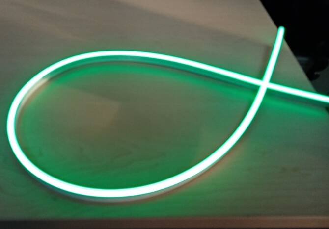 Выглядит холодный неон практически так же, как и обычный стеклянный неон, но при этом обладает значительно большей гибкостью при практически идентичных световых свойствах. Вообще гибкий неон обладает феноменальными свойствами - он ударостойкий, не боится влаги и по этому прекрасно подходит для внутреннего и уличного применения.